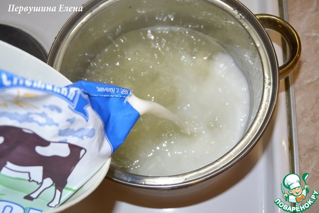 Вскипятить воду, влить молоко. Довести до кипения еще раз. Посолить по вкусу.