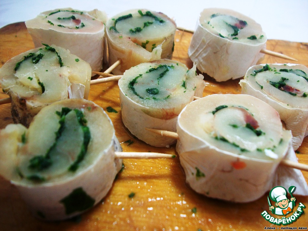 Разрезать рулеты на спиральки и закрепить зубочисткой.