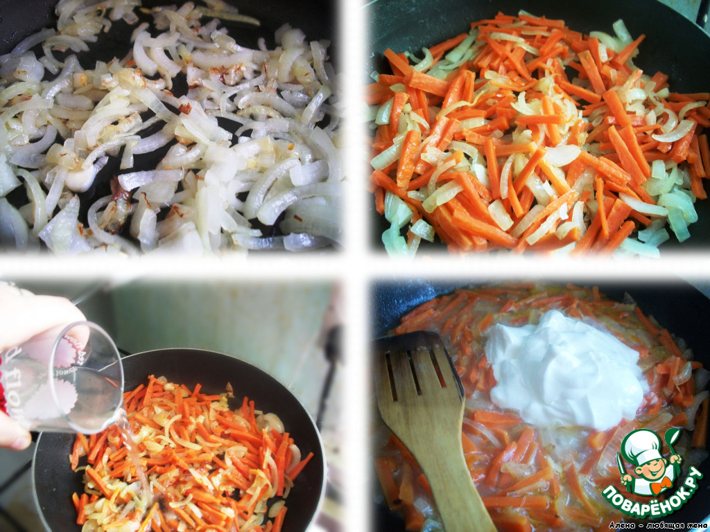 Добавить морковь и продолжать жарить на медленном огне до мягкости моркови.