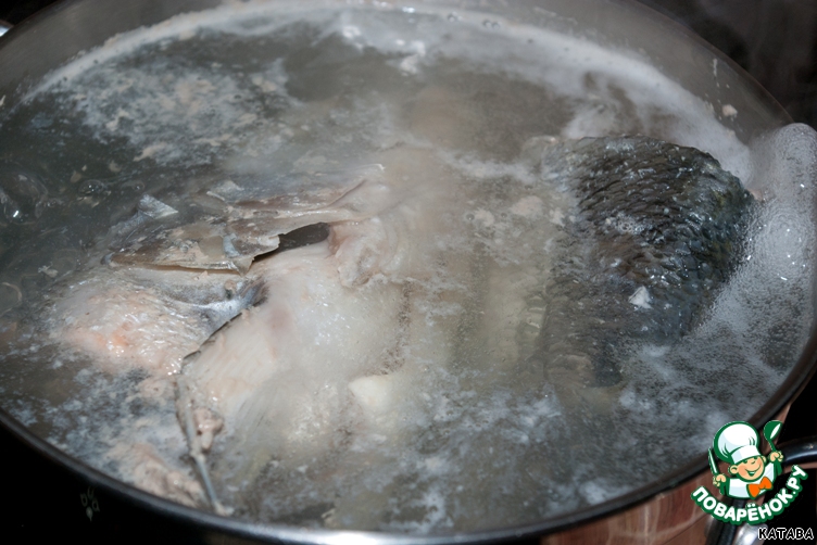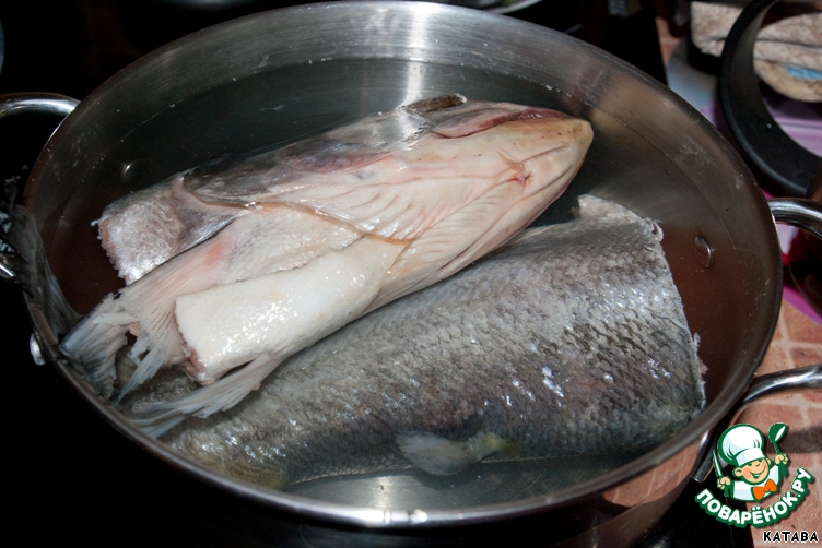 Наливаем в кастрюлю воды (у меня на 4 с лишним литра) и кладем вариться нашу рыбку. Кладите прям крупными кусками - порежете потом. Так и витамины лучше в рыбе сохранятся, и меньше частиц всяких в бульоне плавать будет.