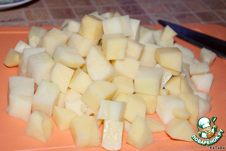Пока рыбка варится, чистим и режем картофель кубиками.