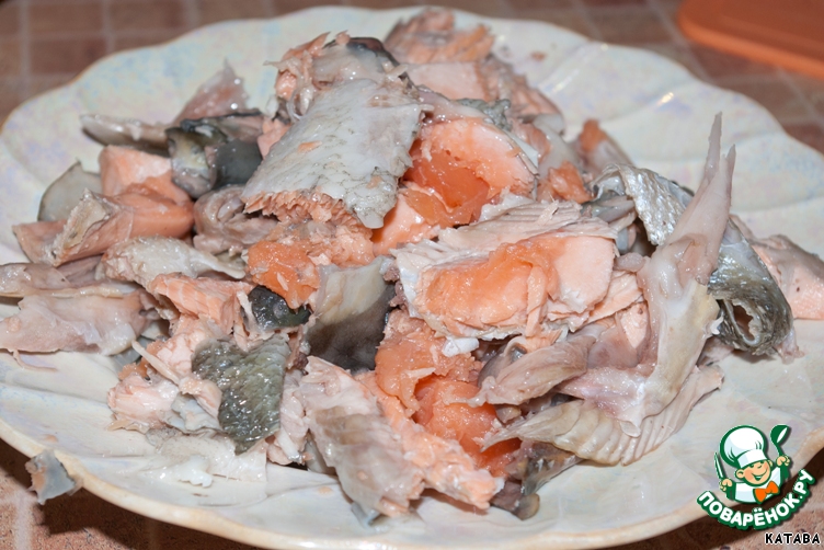 Рыбку вытаскиваем и разбираем на кусочки. Выкидываем кости. Голову тоже разбираем, оставляя только мякоть. У меня немного проварилась не до конца, но это не страшно.