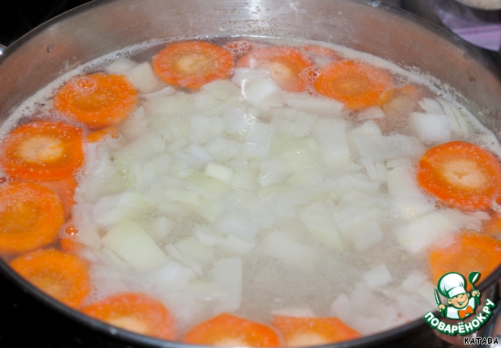 Бульон солим, перчим, кладем в него картофель и варим его до полуготовности. Затем добавляем лук и морковь и довариваем минут 10.