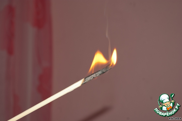 А теперь сюрприз. Чтобы добавить немного кострового аромата, нужно взять деревянную палочку (только не сосновую, конечно, лучше березы, ольхи или вишни). Можно взять китайскую палочку для еды. Только смотрите, чтобы она была березовая, потому что есть еще из бамбука - они не подойдут. Поджигаем палочку...