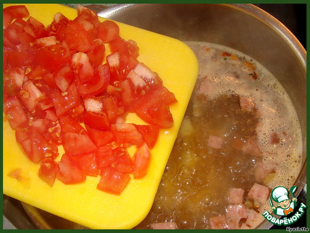 Доводим до кипения и бросаем в суп мелко нарезанные помидоры