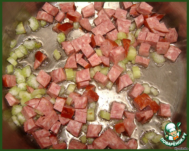 если у вас рыба, нарезать ее кусочками и обжарить вместе с колбасой и сельдереем.