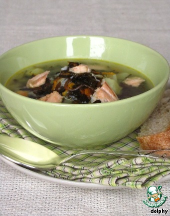 | Рецепт этого блюда был размещeн на сайте в 2008 году пользователем Солнышко9 под названием "Рыбный суп с морской капустой", и иллюстрирован мной в рамках акции «Раскраски». Слова автора: "Очень простой и вкусный суп" ))) От себя добавлю, что готовила я его два раза - с консервированной горбушей, как у автора, и с сырой рыбой. В обоих случаях получается вкусное повседневное блюдо. |