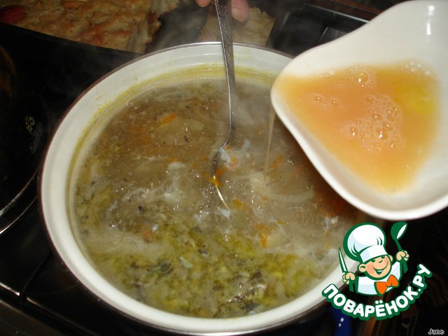 Когда суп почти готов, влить в него яйцо, при этом размешивая суп ложкой.