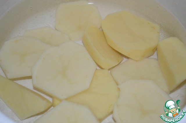 Картофель очистить, нарезать и сварить в отдельной кастрюле. После того как сварится, воду слить, помять.