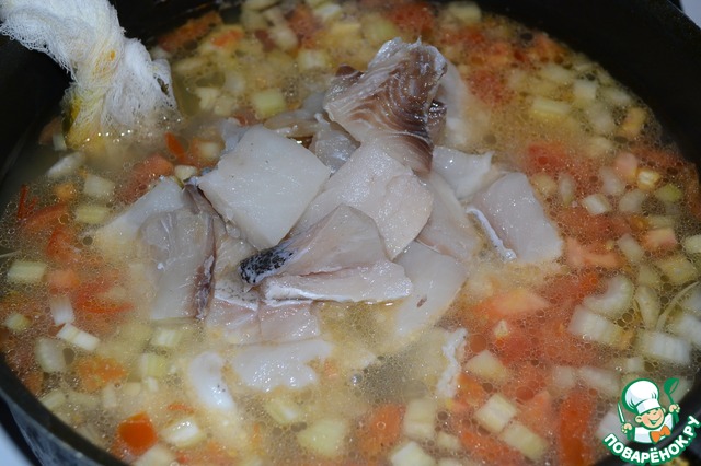 Вливаем к овощам приготовленный рыбный бульон. Сюда же помещаем наш «мешочек гарни», он здесь останется до конца варки. Основа для супа готова. Не забываем посолить.