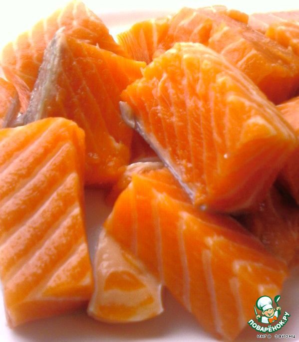 Форель порезать кусочками 5Х3см. Зелень очень мелко нарезать.
