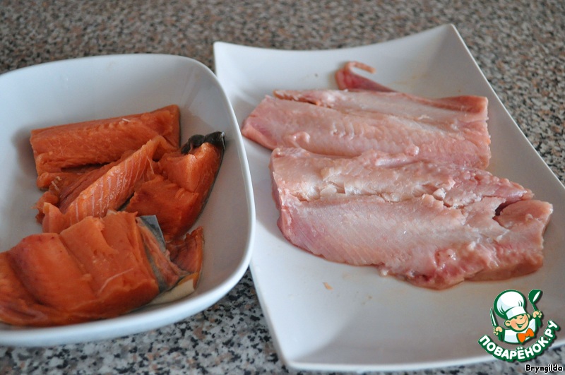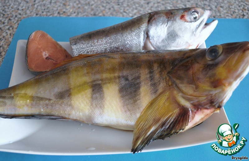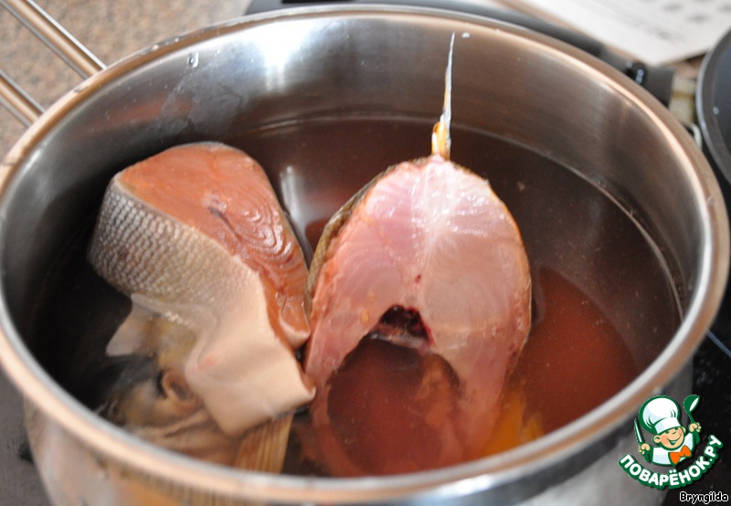 Рыбу разделим пополам. Часть для бульона, часть для запекания.