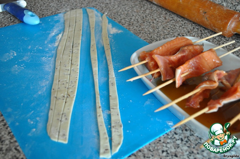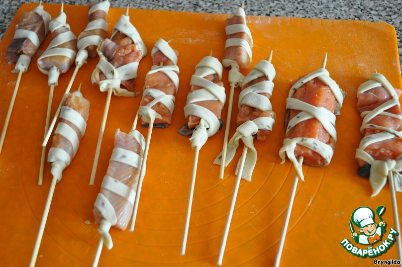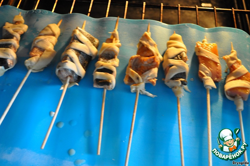Рыбу залить соевым соусом, нарезать и нанизать на шпажки.