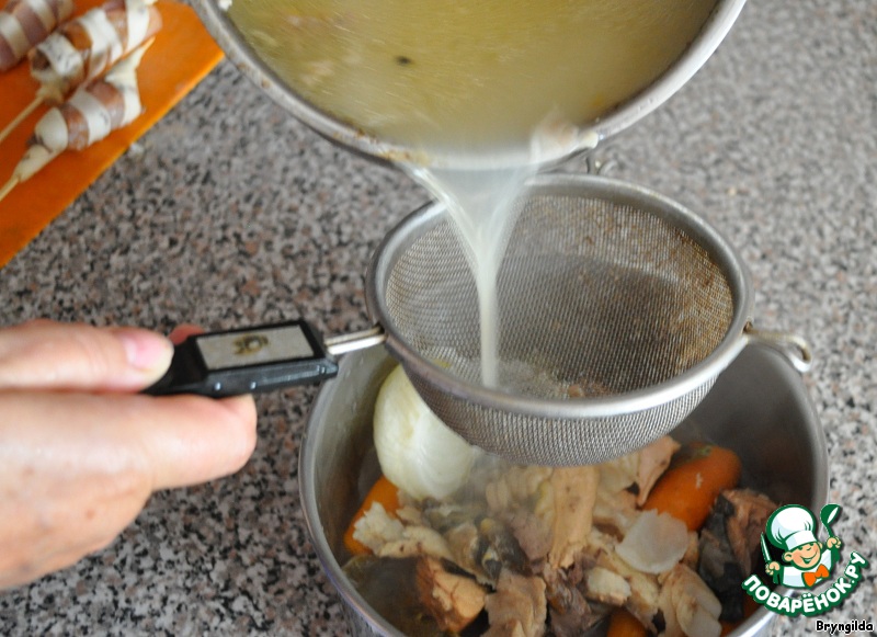 Поставить бульон варить. Добавить лавровый лист, перец горошком и соль.