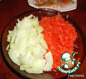 Лук нарезать тонкими четверть-кольцами, морковь натереть на крупной терке или на терке для моркови по-корейски.