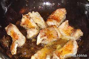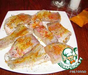 Рыбу при необходимости выпотрошить, удалить плавники, разделать на филе. Филе нарезать крупными кусочками, приправить солью, перцем и шафраном.