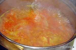 Добавить в кипящий бульон лук и морковь. Довести вновь до кипения и проварить пару минут, добавить тонко нарезанный чеснок и практически сразу снять с огня.