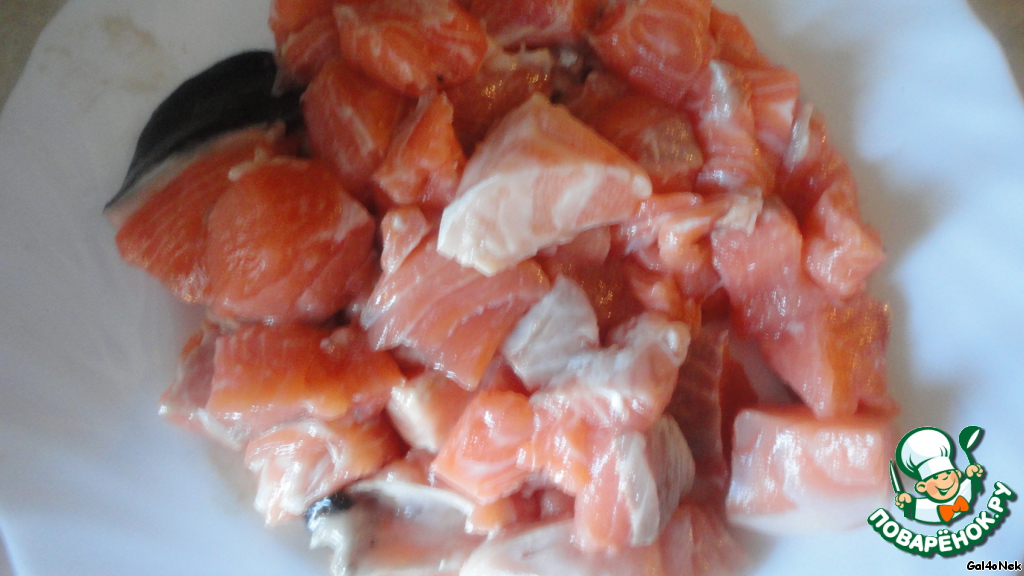 Из куриных ножек поставить вариться бульон с лавровым листом. А тем временем займемся рыбкой. Вот такое количество филе я срезала с головы и одного хвоста.