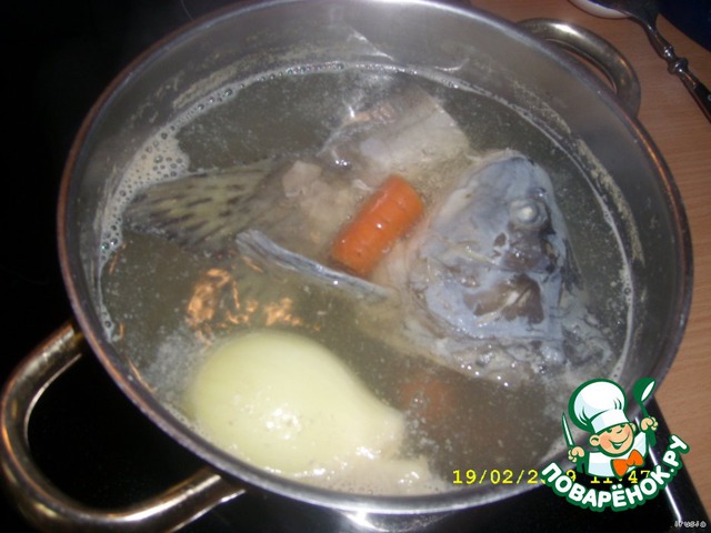 Из рыбы варим бульон с добавлением всех приправ, которые любите. У меня банальные лук, морковь и корень петрушки. На мой вкус этот суп вкуснее, если бульон варим из нескольких сортов рыбы.