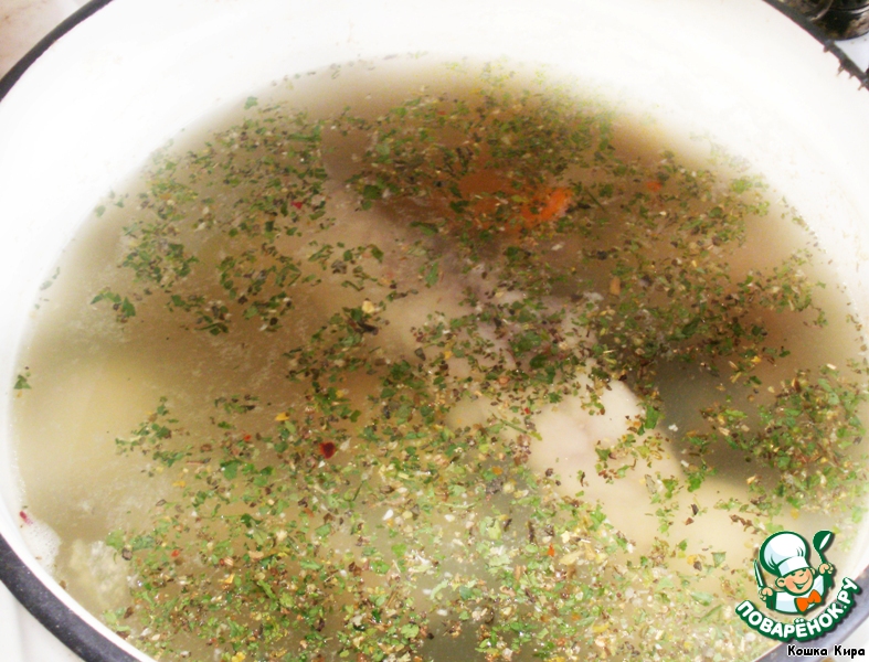 Добавляем специи (я добавляю сушенные травы от торговой марки "Мрія"). И даем закипеть.