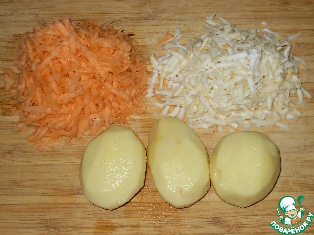 Морковь и сельдерей очистить и натереть на крупной терке. Лук мелко нарезать. Картофель очистить.