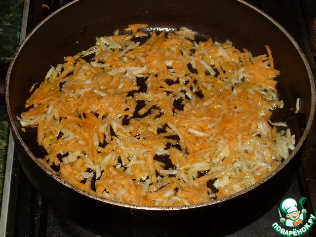 Морковь, лук и сельдерей слегка спассировать на растительном масле,