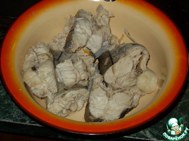 Готовую рыбу вынуть и, когда она немного остынет, очистить от кожи и костей, разобрать на кусочки.