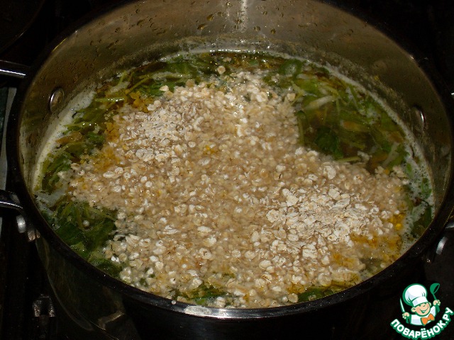 засыпать овсяные хлопья, добавить соль, перец и варить.