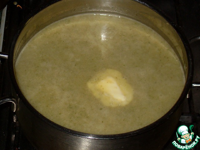Когда овощи сварятся, слить лишний бульон, а суп тщательно взбить блендером. Взбивать надо довольно долго, пока суп не превратится в однородное шелковистое пюре. У меня блендер был на даче, поэтому я протерла суп через сито.