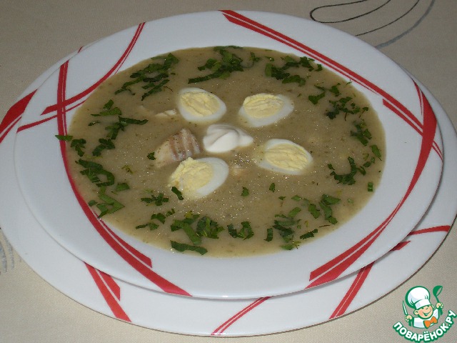 При подаче в тарелки положить половинки вареного яйца (у меня были яйца перепелиные), кусочки рыбы без кожи и костей, сметану и зелень.