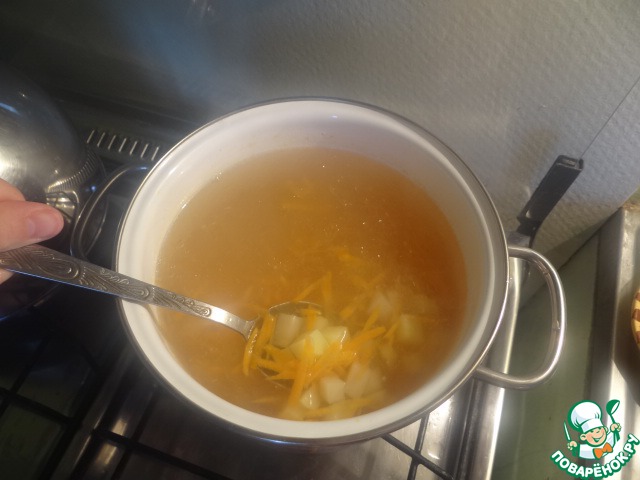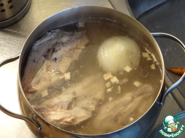 Сварить бульон из куриных спинок, головки лука и смеси кореньев.