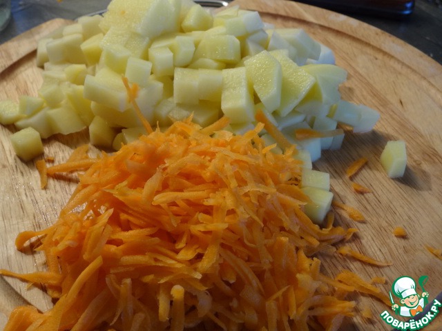 Картофель порезать на мелкие кубики, морковь потереть на крупной терке.