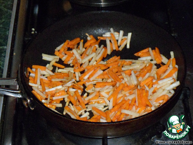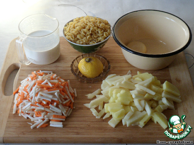 Морковь и сельдерей очистить и нарезать соломкой. Картофель очистить и нарезать брусочками.
