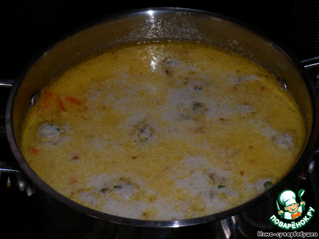 Добавить в суп фрикадельки вместе с отваром, посолить и поперчить по вкусу.
