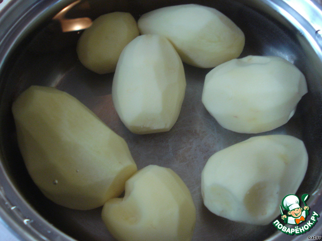 Порезанный брусочками картофель залила кипящей водой и поставила варить почти до готовности. Туда же сразу положила стебли от петрушки, которые в конце лучше вытащить. Можно их связать тонкой белой нитью в пучок, чтобы удобнее было вытаскивать, но когда я так сделала, у меня все развязалось, т.к. приходится помешивать суп. Можно растолочь картошку, чтобы получился суп-пюре.