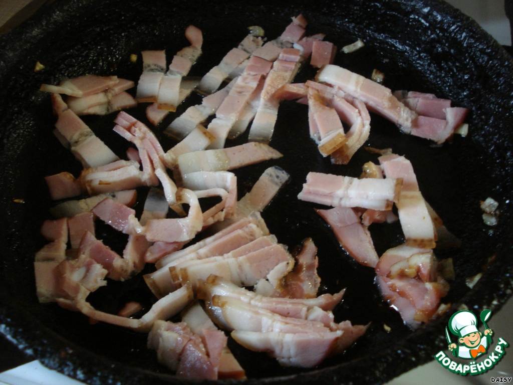 Грудинку порезала тонкими полосочками и немного обжарила без добавления жира.