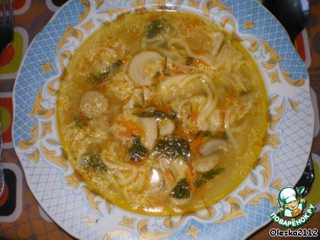 В кипящий куриный бульон всыпаем лапшу (лучше конечно домашнюю, но ведь нет времени :-D ) и сразу же добавляем пассерованные овощи и грибы. Солим нашу лапшу (если не солили бульон). Добавляем специи и лавровый лист.