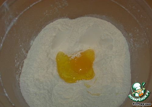 На стол или в миску высыпать горкой муку, сделать в ней лунку и разбить туда яйцо, посолить.