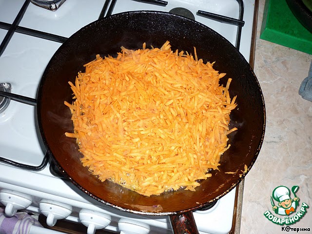 Натираем на тёрке морковь и пассируем её на сковородке (я лук не люблю, поэтому готовлю без него) минут 10. Добавляем в кастрюлю. Варим ещё минут 5.