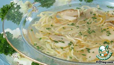 | ... или можно на бульонном кубике. Лапша из теста своего замеса с грибочками. Вкусно и с обычным кубиком. Несложно в приготовлении и не требует много продуктов. |