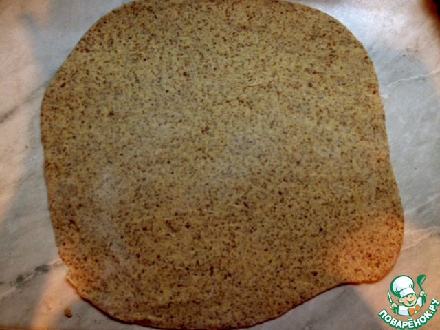 Тесто получается очень упругим, но в то же время податливым и нежным, работать с ним одно удовольствие! На присыпанном мукой столе раскатать тоненькую лепешку, дать ей немного подсохнуть.