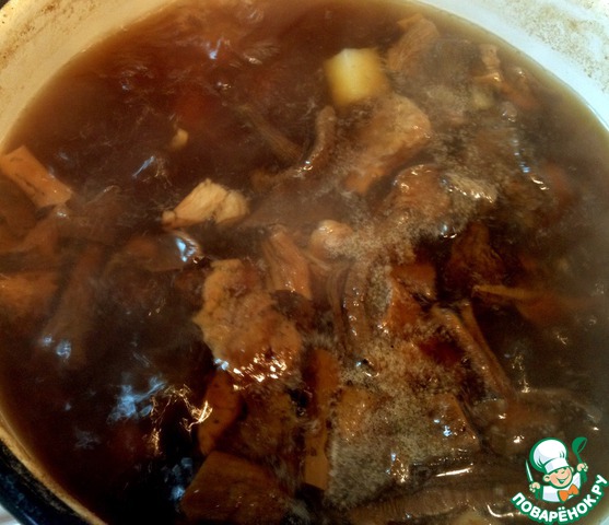 Пока тесто мое отдыхает, я варю супчик. В кипящую воду кладу предварительно замоченные белые грибы и нарезанный картофель.