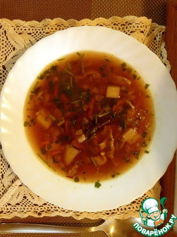 К этому времени из кастрюли с супом по кухне распространяется волшебный аромат белых грибов, и с готовностью картофеля я добавляю зажарку и лапшу. Спустя 5 минут суп готов, по желанию можно добавить петрушечки и подавать на стол.