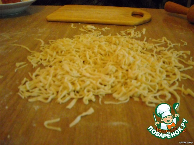 Готовим лапшу: замесить тесто из яйца соли и муки и оставить отдохнуть минут на 10- 15.