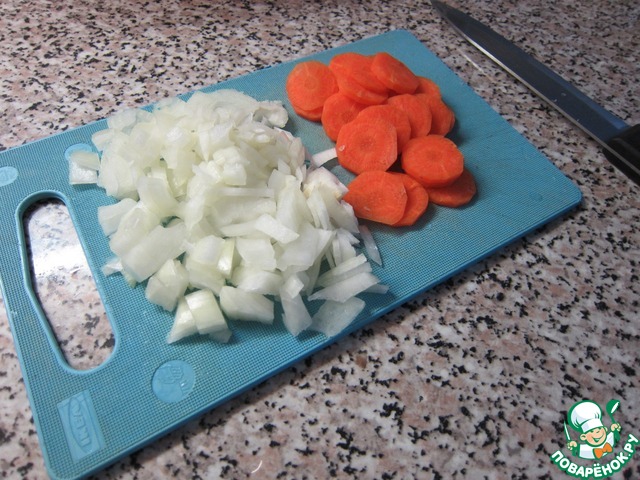Отправляем в кастрюлю лук с морковью и варим все 5 минут (на среднем огне).