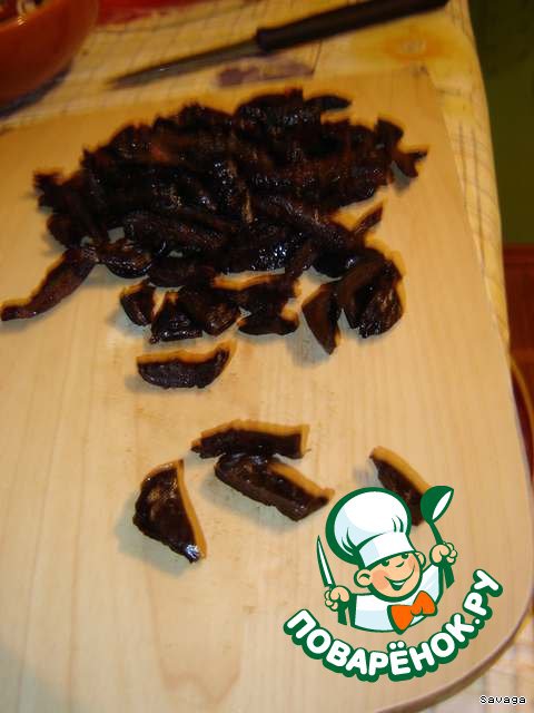 Пока готовится мясо, нарезаем мелкими дольками чернослив и откладываем в мисочку (фото, к сожалению, не вышло).