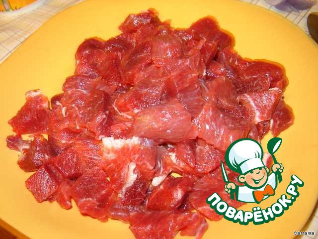 Нарезаем небольшими кусочками (1х2 см) мясо.