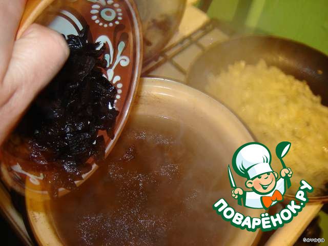 После того как мясо проварилось около часа, засыпаем в него чернослив и варим еще минут 15-20.