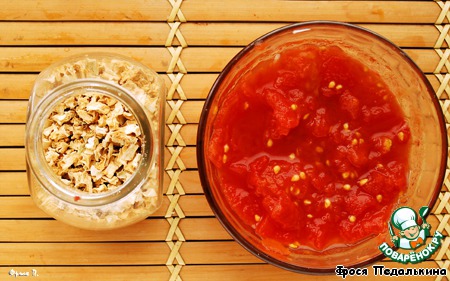 Сушеный сельдерей замочить в 1 ст.л. теплой воды. Консервированные томаты очистить от кожицы, порезать, сок собрать.