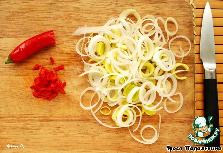 Белую часть лука-порея порезать колечками. Перец чили освободить от семян и перегородок, мелко порезать.